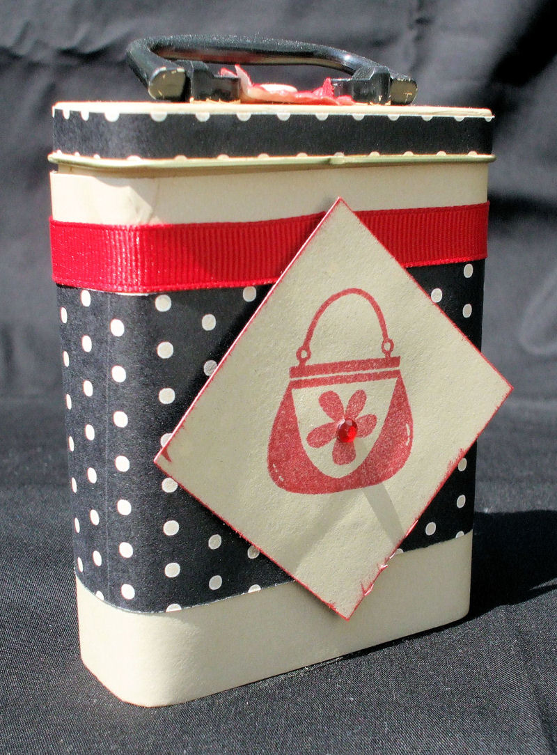 I used CTMH Silhouette paper to alter the tins, as well as a bit of paint and ribbon. They started out as Provo Craft Band Aid tins. I added a Just Blooms flower to the top to finish it off. Cute and easy.